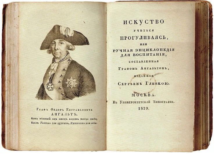 "Искусство учиться прогуливаясь, или Ручная энциклопедия для воспитания, составленная графом Ангальтом, изданная Сергеем Глинкою. М. тип. университета, 1829. 189 с., 1 портр., 6 гравюр, 1 факсимиле. В полукожаном переплете".