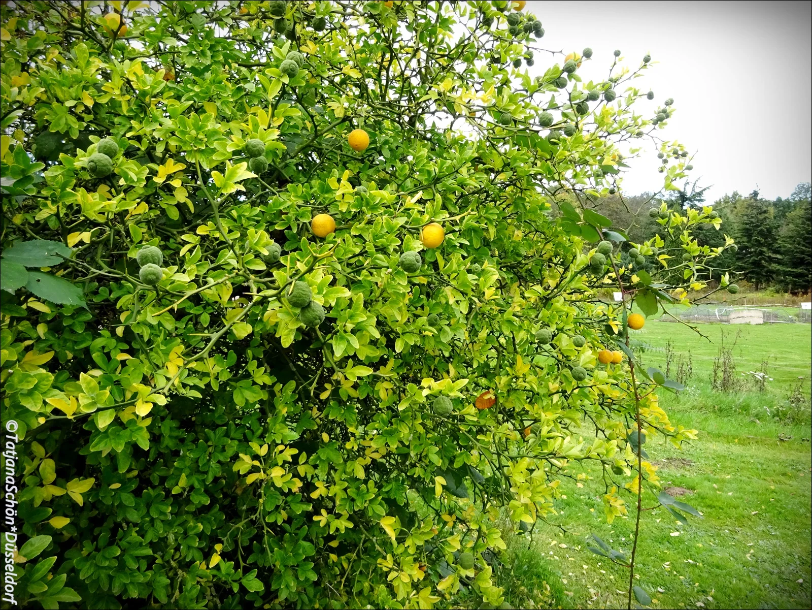 Понцирус Трифолиата - кустарник или небольшое деревце с шатровидной кроной, колючее (колючки длиной 1—3 см). Плод — шаровидный диаметром 4—6 см золотисто-жёлтого цвета, с мягкой коркой, густо покрытой бархатистым пушком.
