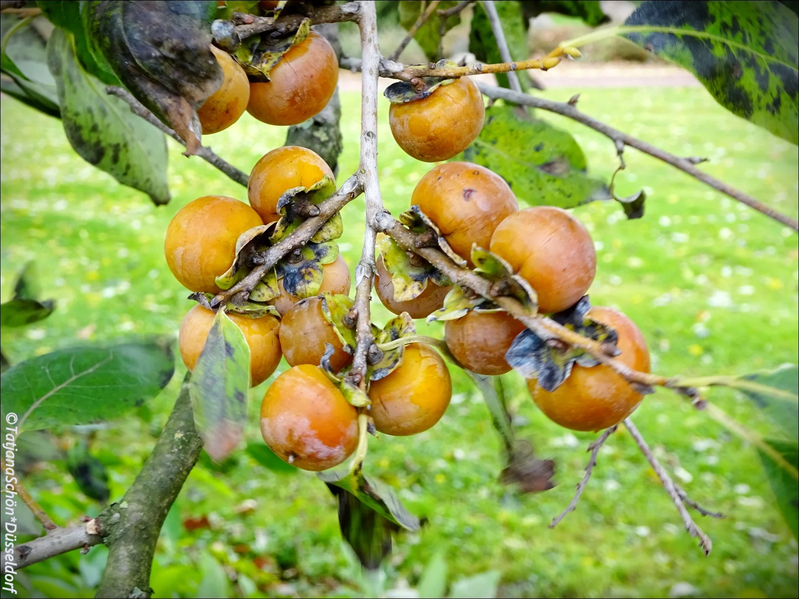 Хурма обыкновенная (или кавказская, лат. Diospyros lotus) нашлась — растение семейства Эбеновые (Ebenaceae), вид рода Хурма, произрастает в субтропических районах Евразии. Здесь её обозначили как лотусную сливу :-) Хорошо, что в ботаническом саду есть таблички!