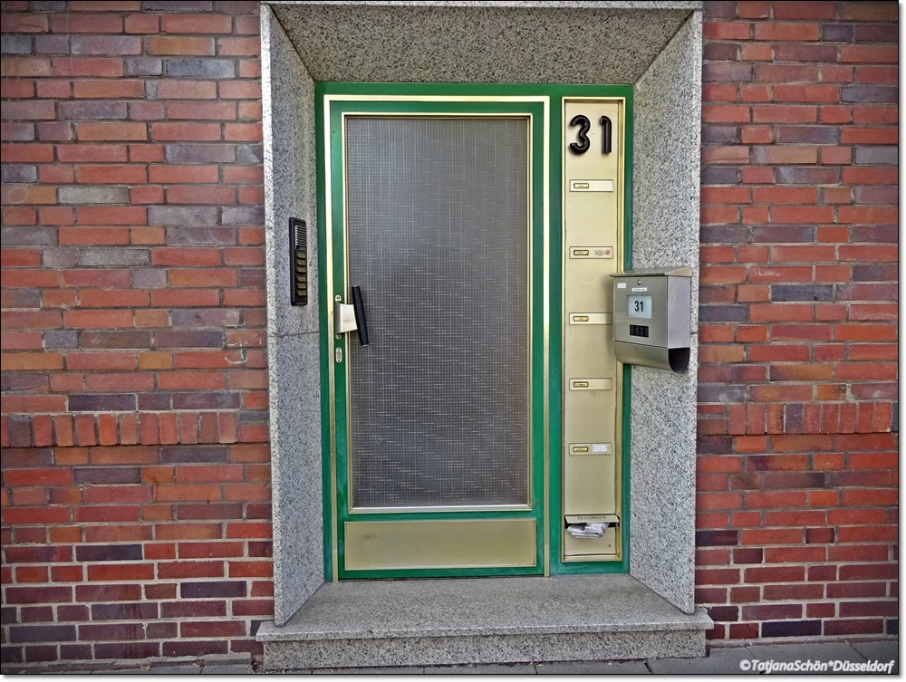 А вот - "деревенская" дверь (дом в Урденбахе). Многоквартирный (о чём "говорят" почтовые ящики). Обратите внимание на "окирпиченное" окно.