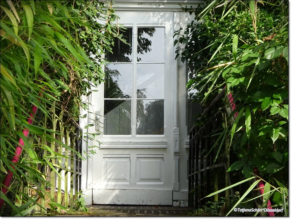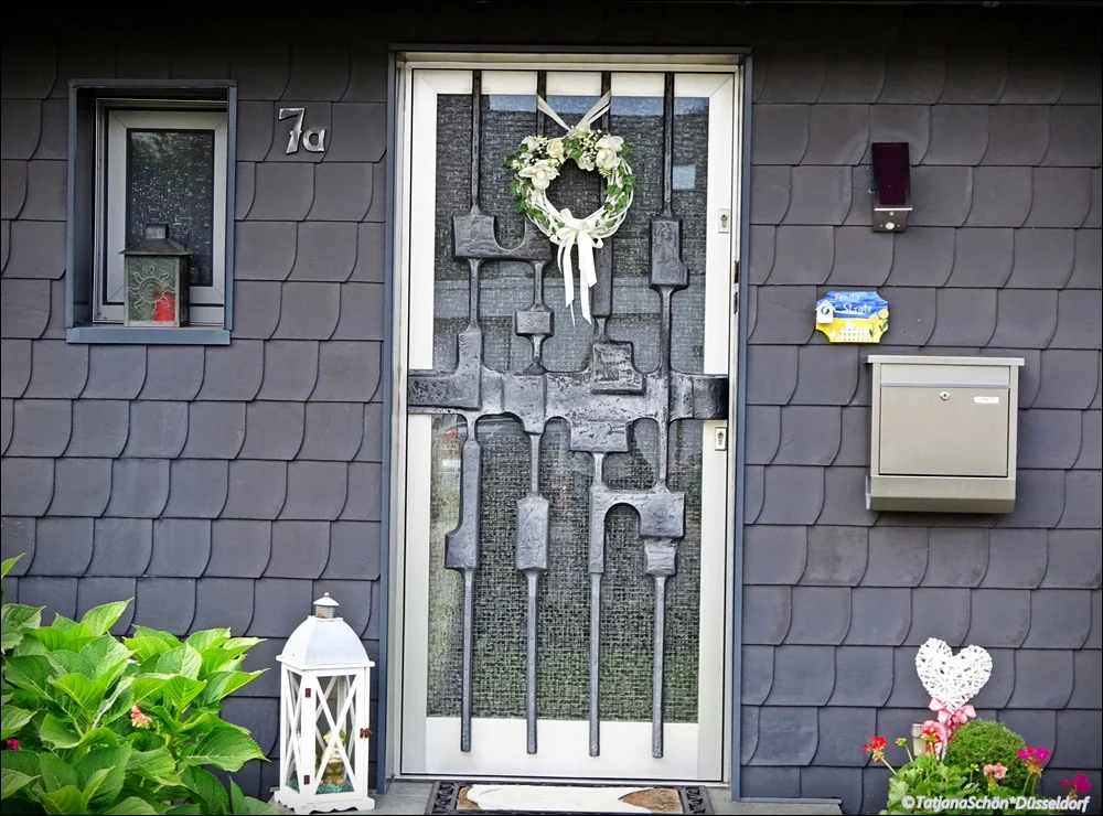 Современное жильё. Частный дом на одну семью. Там рифлёное стекло за неравномерной ковкой среди чешуйчатого фасада. Под дверью - белое полотенце на коврике. На малом окошке как и у самой двери - фонари-подсвечники... Веночек на двери, плетёное сердечко в вазоне с геранью - это окружение только одной "обыкновенной" частной двери в "деревенском" районе Дюссельдорфа. Я считаю эту дверь очень ценной и охотно в неё всматриваюсь. Она мне о многом говорит.