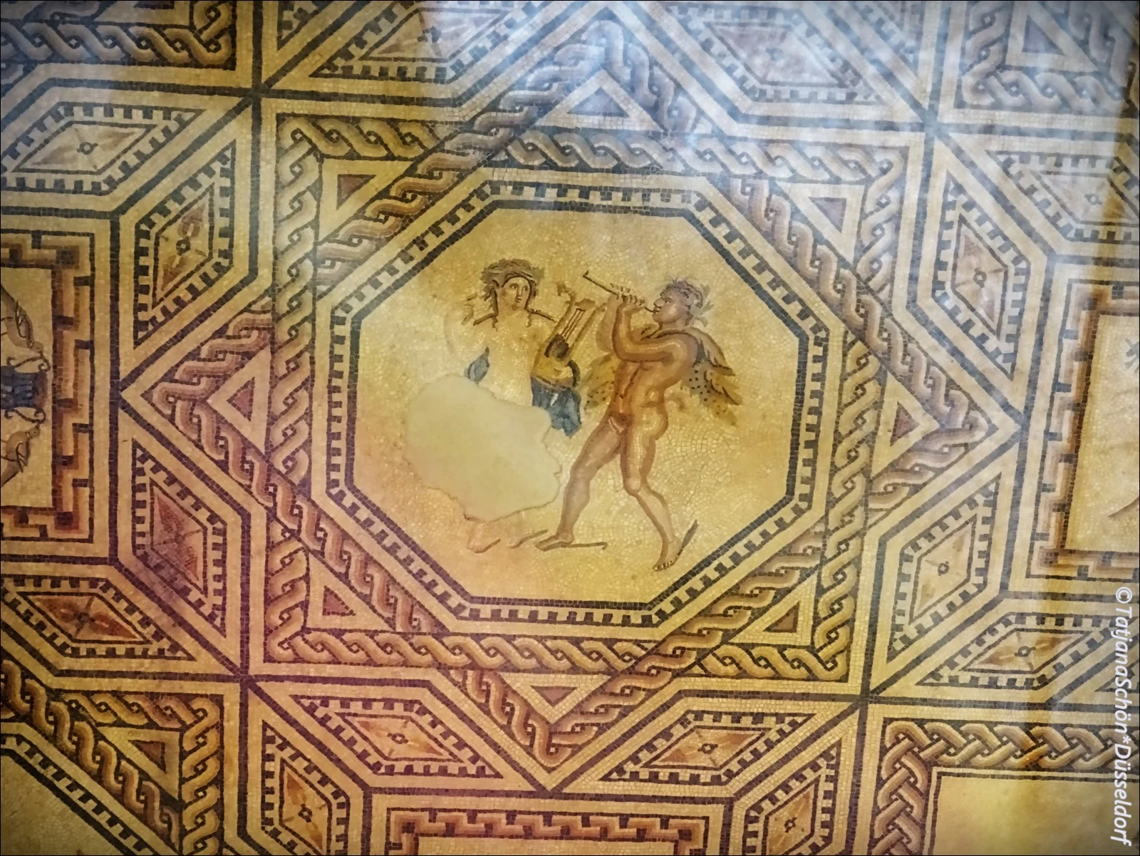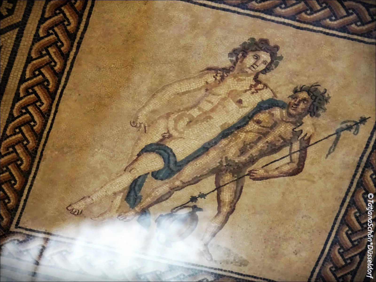 Напротив мастерской строителей собора (собор, хоть и достроили, но не окончательно) - античная мозаика с брутализмом над ней: пикантный напольный декор античной римской виллы.