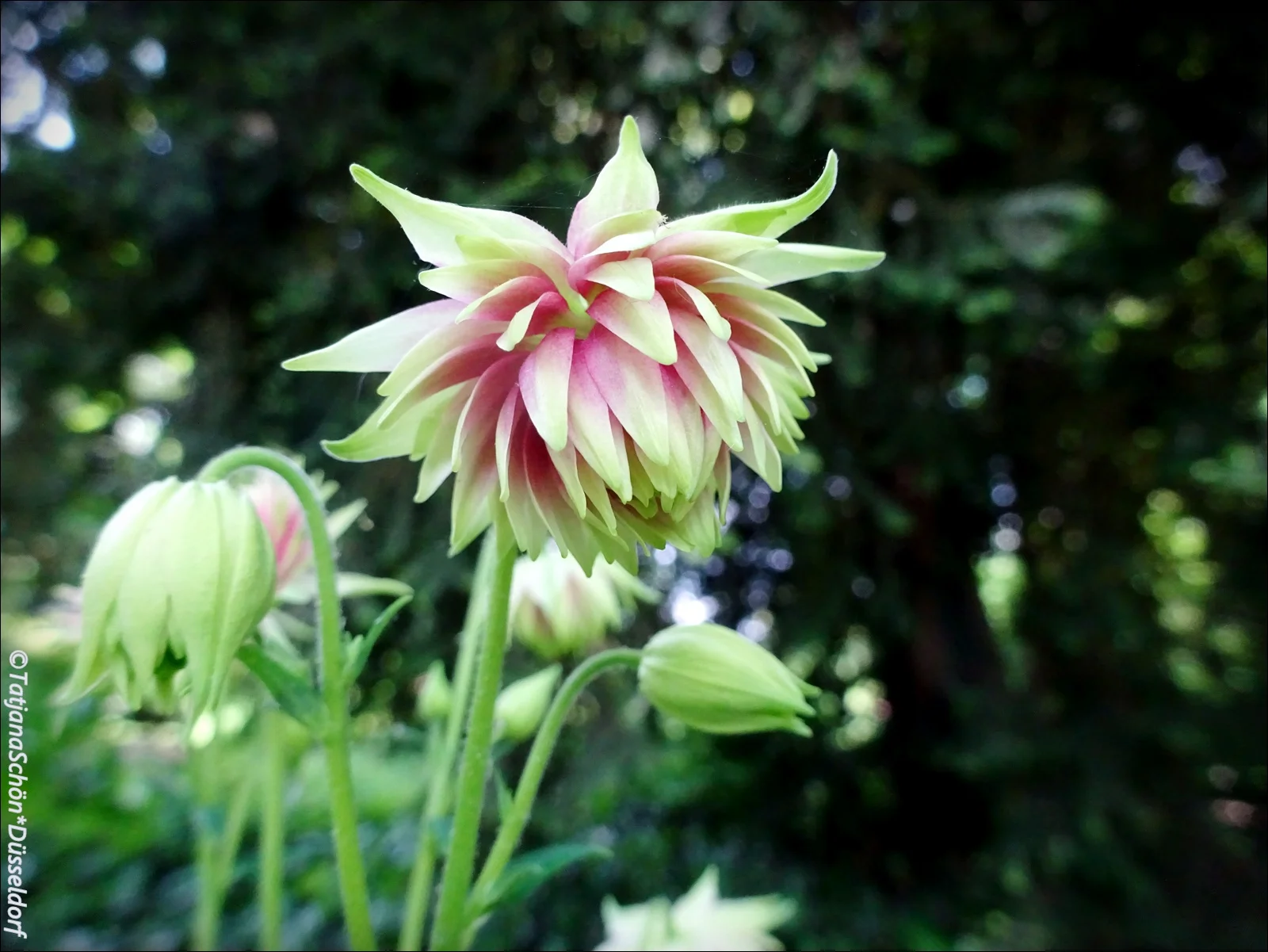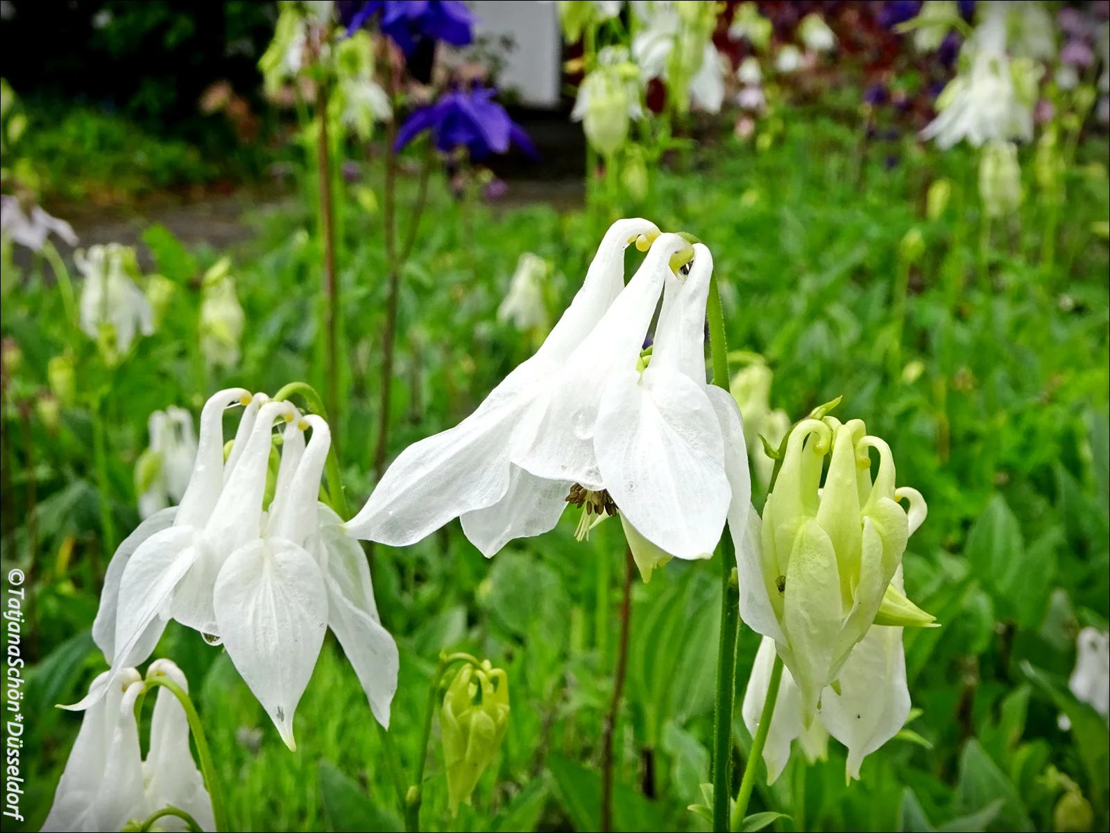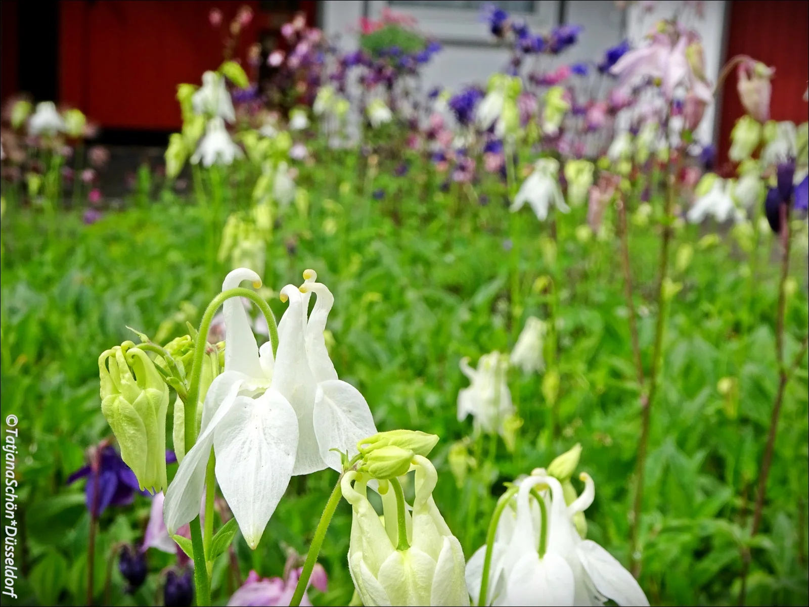 После помощи виртуальных собеседников выяснилось, что это водосбор (или аквилегия, что по-немецки Akelei), но мне сначала для признания его водосбором "хвостиков" не хватало, а лепестки его"многоэтажные"... Так вот, знающие люди объяснили, что у водосбора бывают и махровые цветки и я теперь тоже буду знать, что у водосбора не пять частей (как я думала).