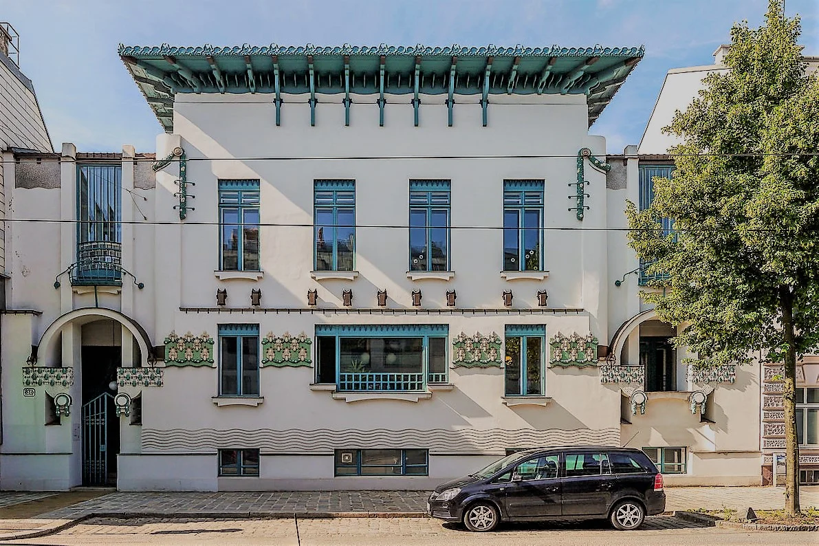 На фото выше - Вилла Вагнера 1 (там внутри здания - музей Фукса, вход за 11 евро), территория и "грот" в свободном доступе в часы работы музея. А вот соседняя Вилла Вагнера 2 - частный дом, можно только через забор на дверь глянуть - на первом фото.
