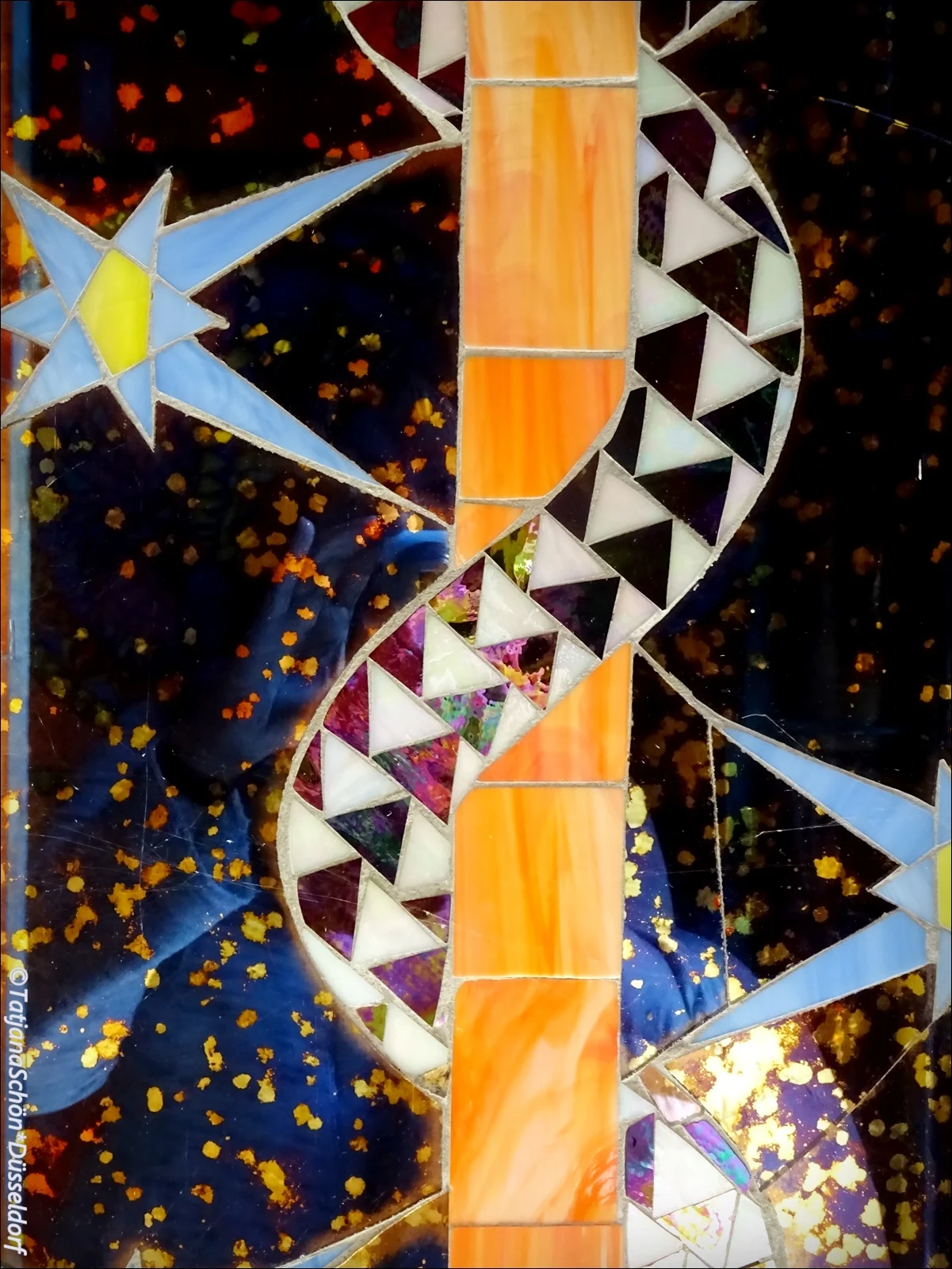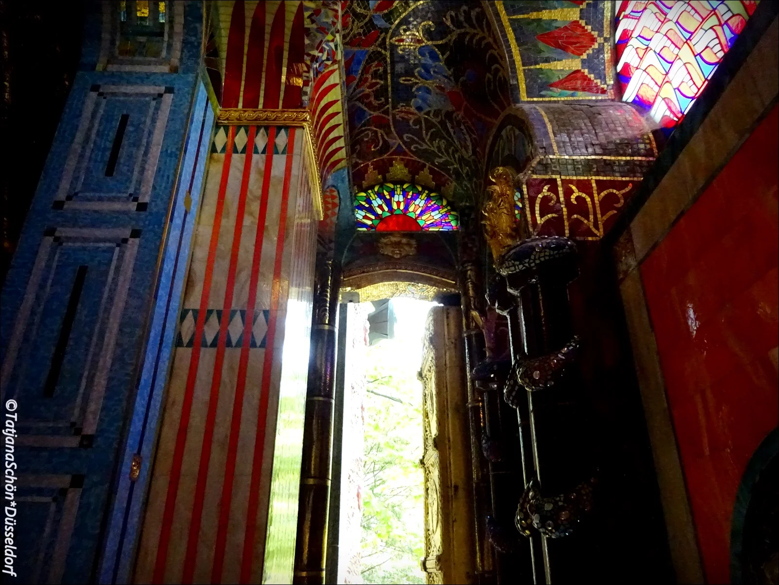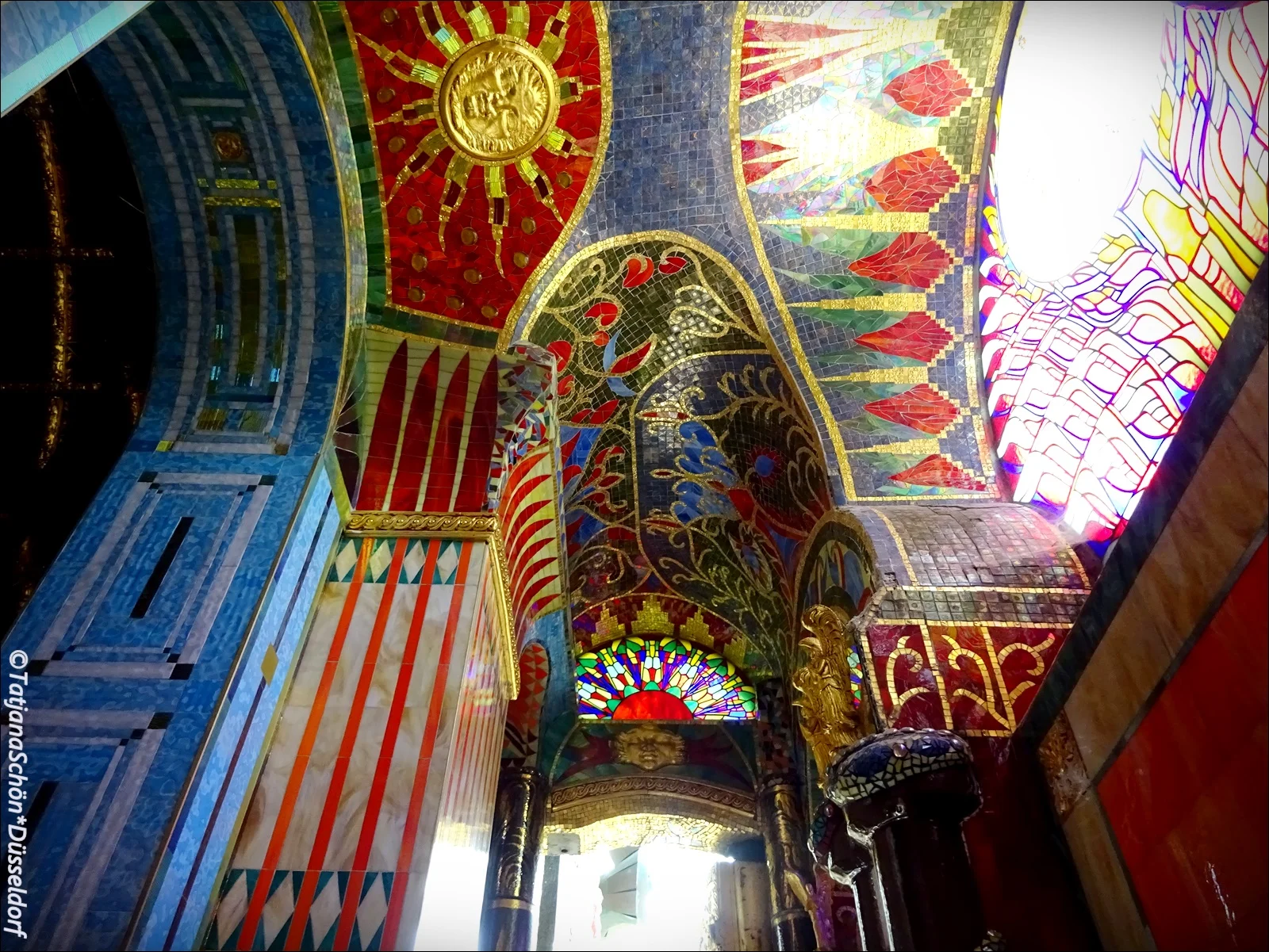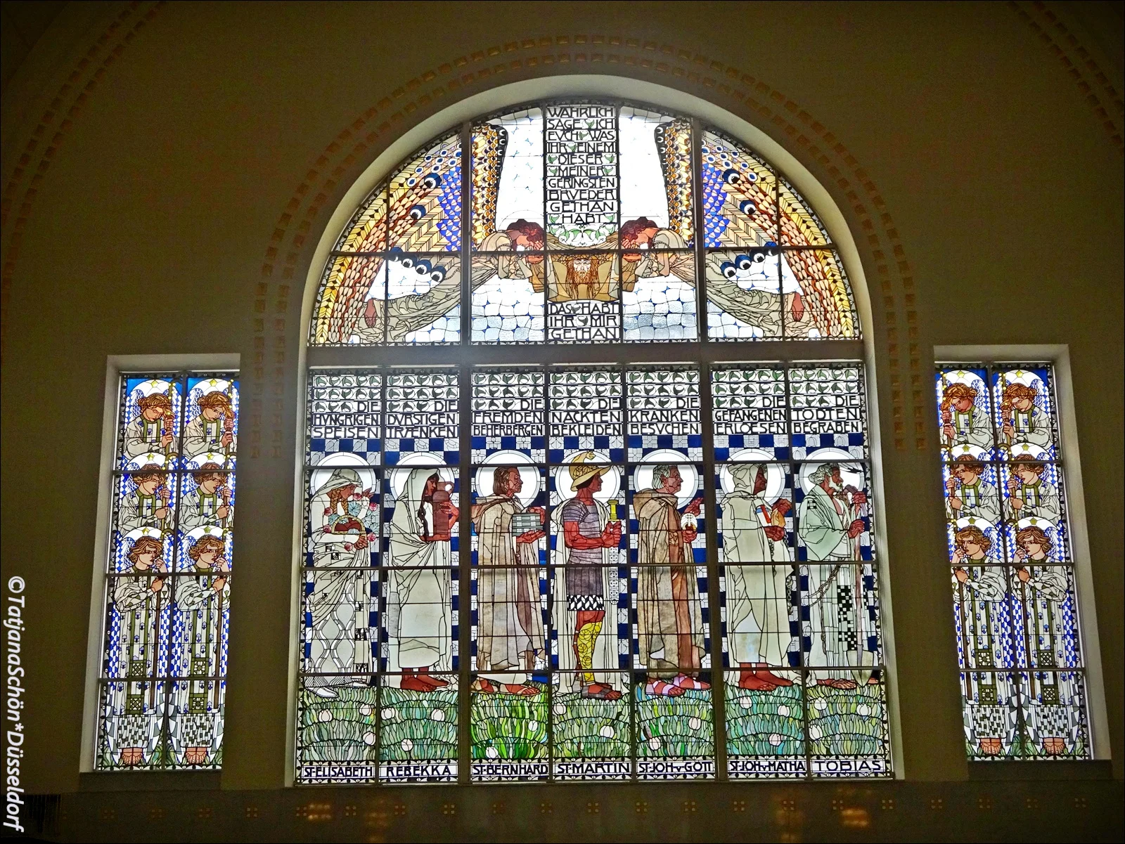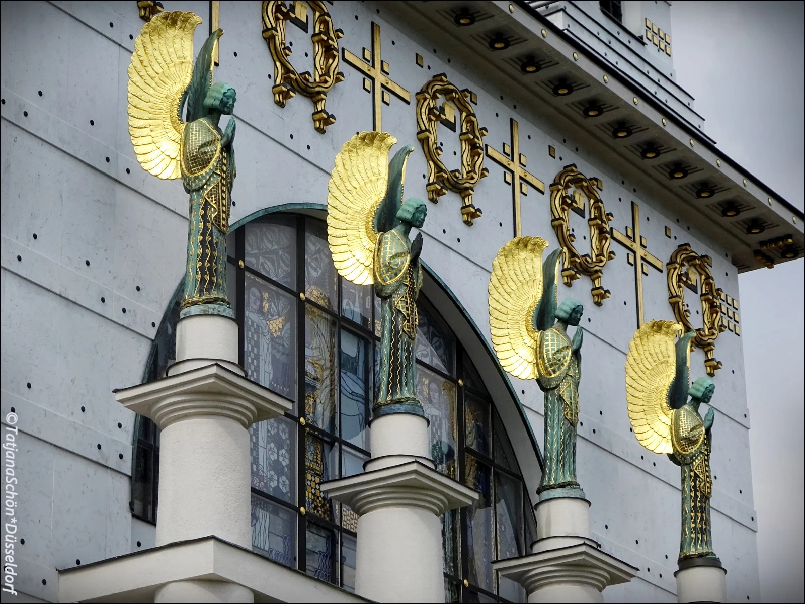 Имя скульптора ангелов Отмар Шимковиц (Othmar Schimkowitz, 1864-1947). Там же на витражах Коломана Мозера (мы их эскизы видели потом и в музее*) Семь деяний милосердия: