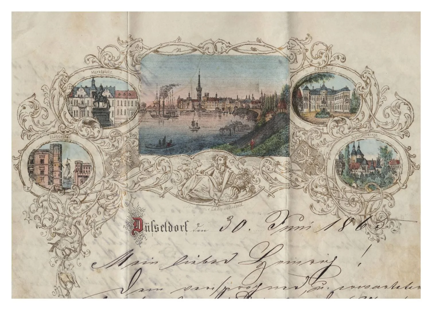 Вот письмо из Дюссельдорфа. 1865 год. С иллюминированием, похожим на старинные книжные (как я люблю). С достопримечательностями в виньетках и подписями (забавно: Сантк-Андреаса полтора века назад Иезуитской церковью величали). *Совсем как мои записи с картинками и подписями к ним!*
