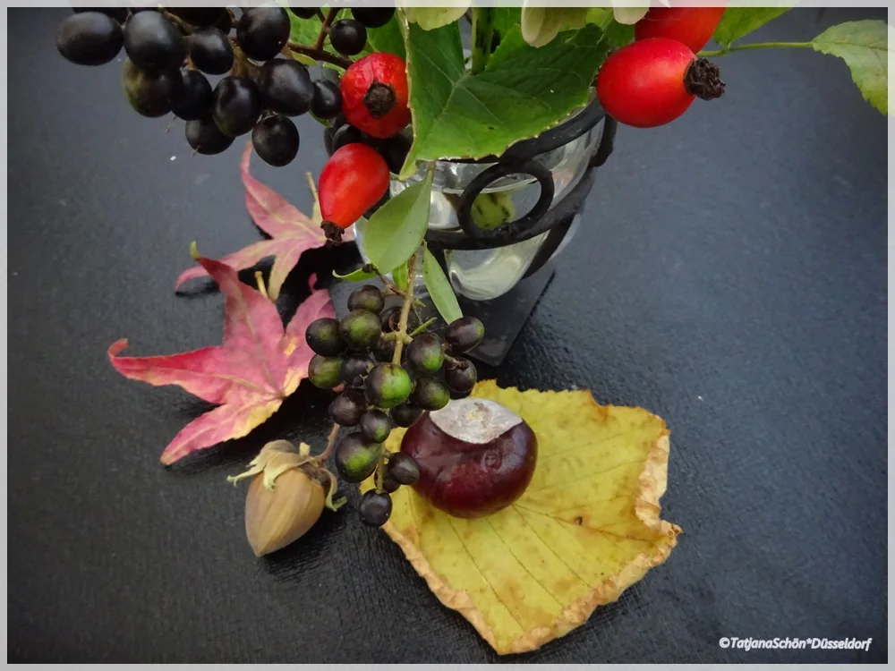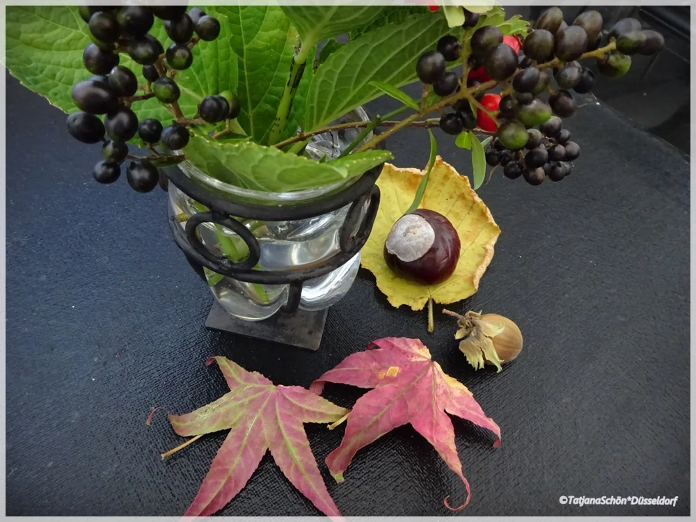 Вот такой мини-натюрморт у меня плодово-ягодный и листовой насобирался. Чёрные плоды на веточке - бирючина, красный шиповник (в вазочке с соцветием садовой зелёной теперь гортензии), листья орешника и амбрового дерева, каштан и орех, найденные по дороге домой.