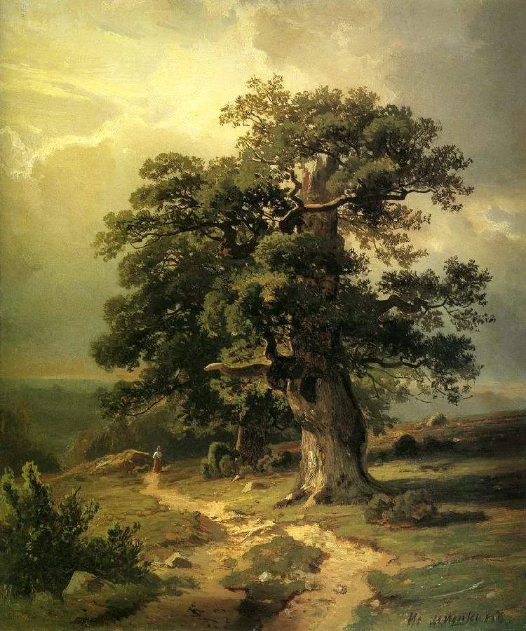 Этюд к картине "Вид в окрестностях Дюссельдорфа" - Дуб / 1865г, дерево, масло, 41,5x34,5см / Государственный Русский музей, Санкт-Петербург. Этот же дуб художник использовал через много лет при создании картины «Среди долины ровныя».
