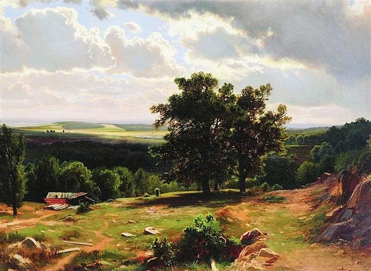 Шишкин многое почерпнул* у художников дюссельдорфской школы — братьев Андреаса и Освальда Ахенбахов и придал лесному пейзажу небывалый дотоле размах, вдохнул в него чисто русскую эпическую широту.