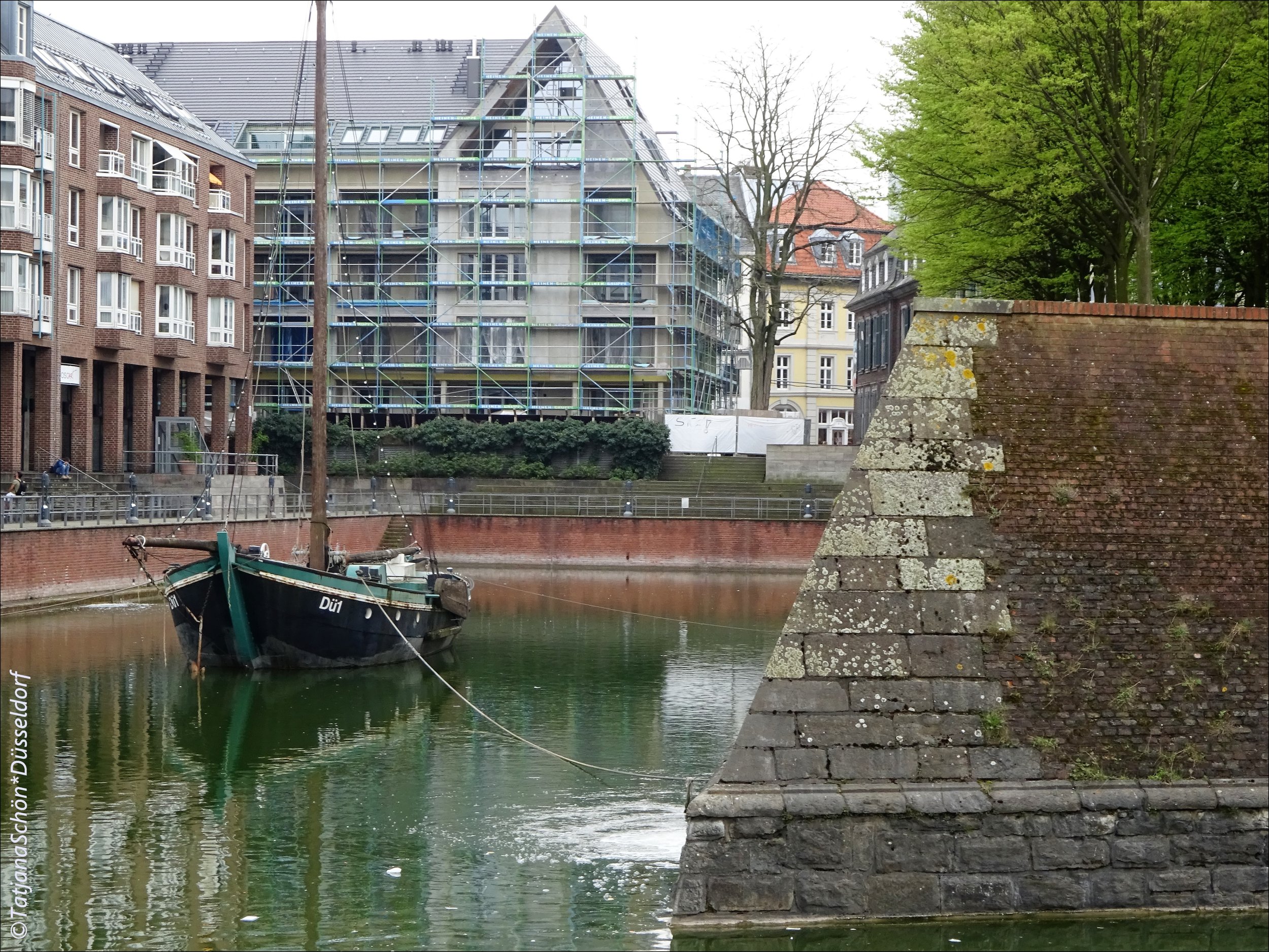 Теперь, кстати о современности, в Старом городе Дюссельдорфа уже нет рыбачьего судна в гавани — его убрали в прошлом году. Не ищите этого, как на фото.