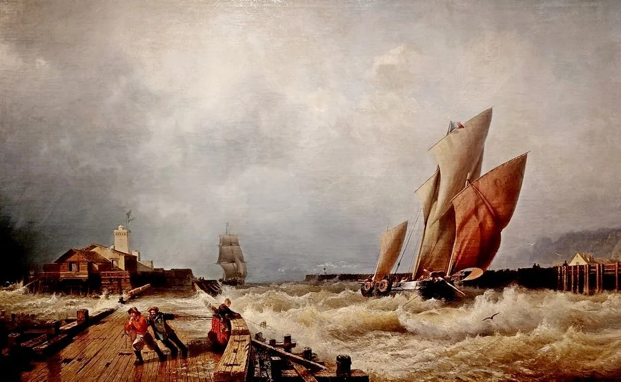 Эта его картина действительно несёт на себе явный отпечаток романтической школы: эффектные пенящиеся волны, накренившиеся паруса, низкое грозовое небо, маленькие фигурки рыбаков, из последних сил пытающихся ввести судно в спасительную гавань. Мне она (даже не очень нравится) кажется не столько про реализм с «неукоризненной» передачей, сколько эмоцией. Волны кажутся выше, чем они бывают, небо — тяжелее, чем в действительности. Но мы можем увидеть здесь не только море, но и человеческое усилие: напряжение, ожидание, надежду.